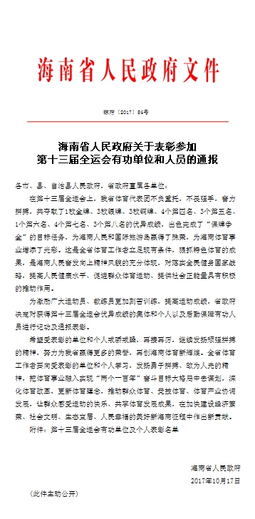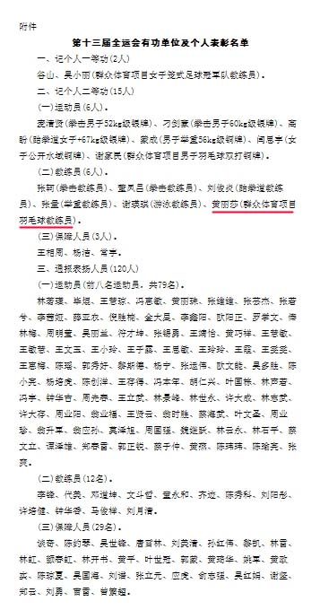 近日,海南省人民政府发布关于表彰参加第十三届全运会有功单位和人员的通报,决定对获得第十三届全运会优异成绩的集体和个人以及后勤保障有功人员进行记功及通报表彰。其中我校体育部黄丽莎老师作为群众体育项目羽毛球教练员获得个人表彰,记个人二等功。