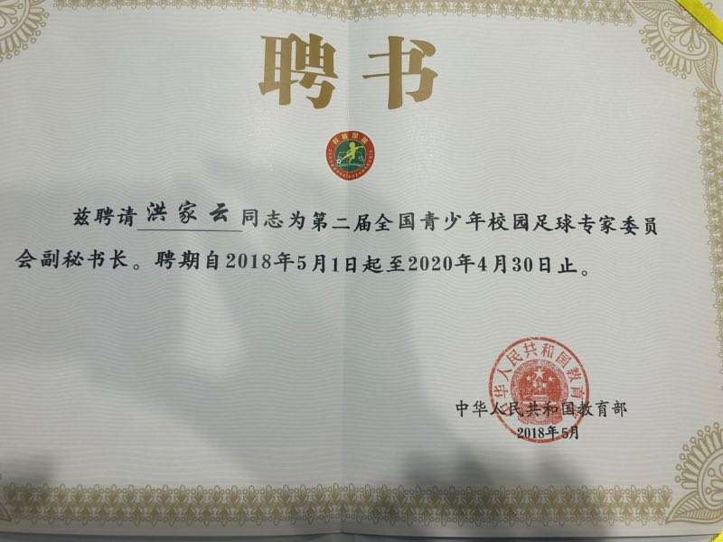 近日,教育部《关于公布第二届全国青少年校园足球专家委员会委员名单的通知》(教体艺函〔2018〕7号)公布了第二届全国青少年校园足球专家委员会组成名单,我校洪家云教授被特聘为专家委员,并担任本届委员会副秘书长。此次当选委员由中华人民共和国教育部颁发聘书,任期两年,自2018年5月1日至2020年4月30日止。