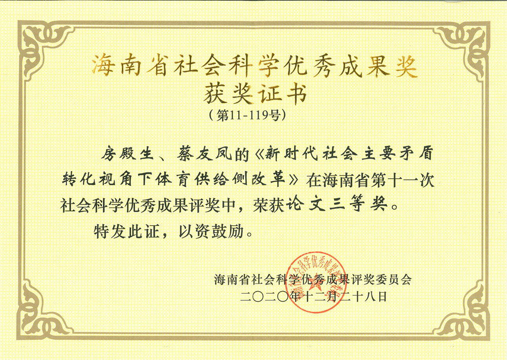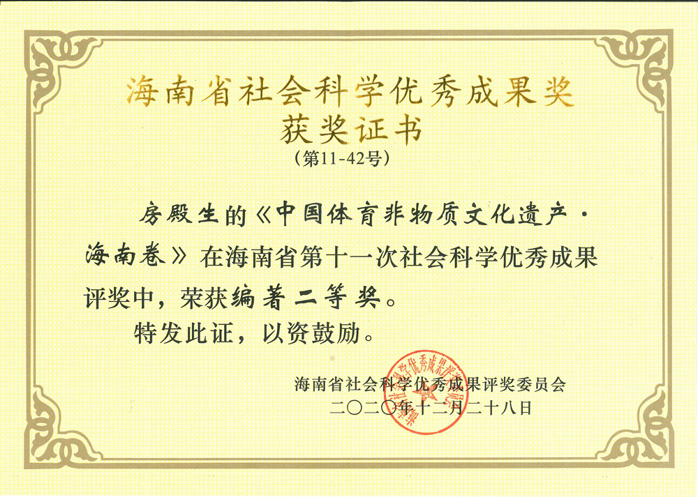 2021年1月20日,第十一次海南省社会科学优秀成果奖颁奖大会在海口召开。我院老师房殿生获2项优秀成果奖,其中,《中国体育非物质文化遗产·海南卷》获编著类二等奖;《新时代社会主要矛盾转化视角下体育供给侧改革》获论文类三等奖。