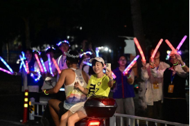 夜色下、光影中,涌动的选手们手持各色荧光棒、佩戴荧光头饰和手环,犹如一条荧光长龙奔腾,照亮了yl6809永利官网集团各个角落,留下了律动青春足迹,形成一道亮丽风景线。每一个夜跑人都在尽情享受着奔跑的快乐,他们用热情点亮希望,用青春告白祖国。