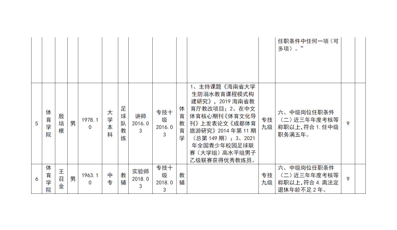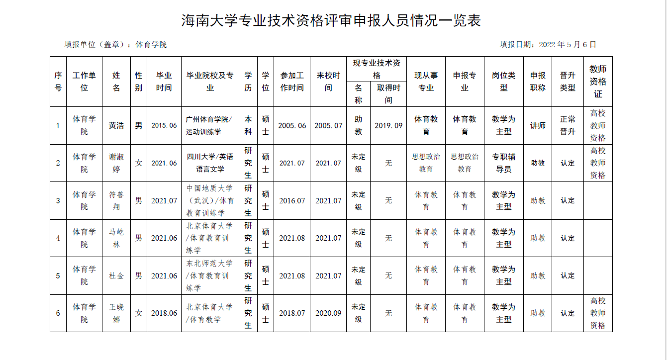 根据《海南省人力资源和社会保障厅关于我省事业单位岗位设置管理有关问题的通知》(琼人社发[2013]54号),《yl6809永利官网集团岗位设置及聘用方案(修订)》(海大[2020]103号)等相关要求,由教职工本人申请,共有6名教师提出2022年度专业岗位聘用申请、10名教师提出专业技术评审和认定申请, 学院基层评审委员会审核,并票决全部通过。具体名单如下: