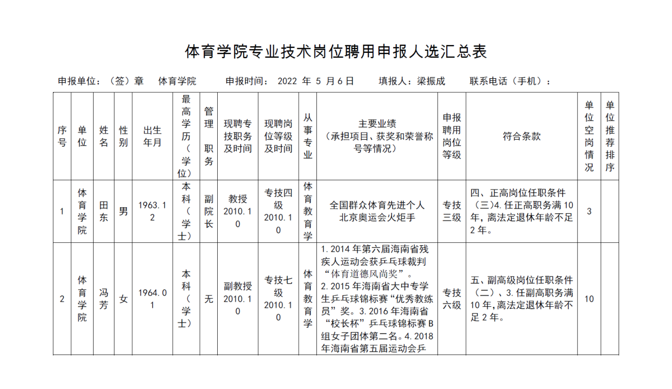 《 yl6809永利集团专业技术岗位聘用申报人选汇总表》
